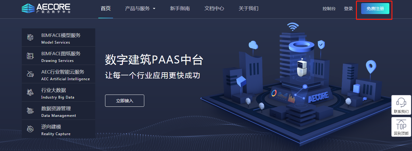 若没有银河集团(galaxy)账号,请点击AECORE官网右上角“免费注册”按钮,进行注册。