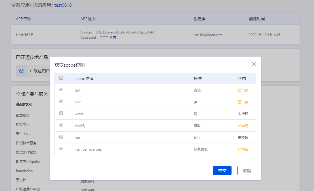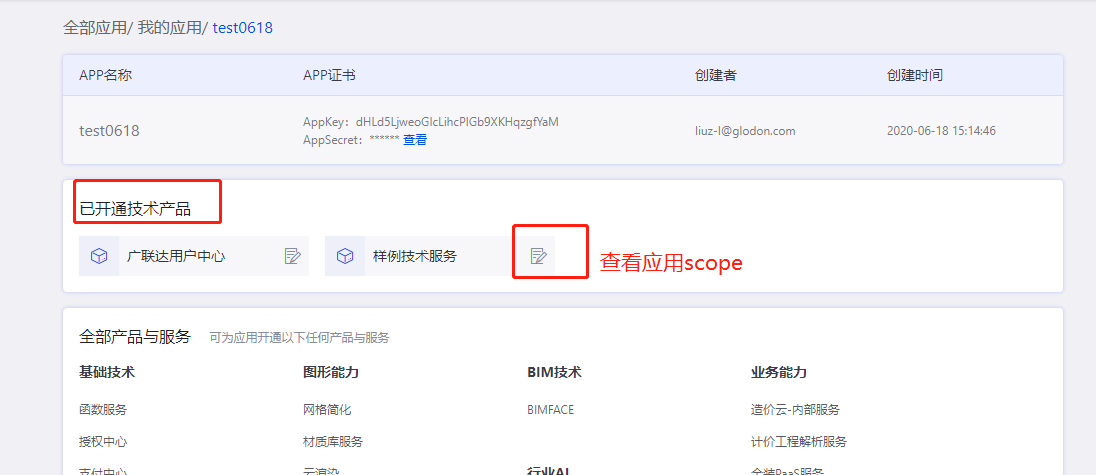 5.服务开通后,在应用详情页就会展示当前已开通的服务信息,但服务功能是否可以掉通,一定要查看对应服务的scope授权状态,只有“已授权”状态才可以