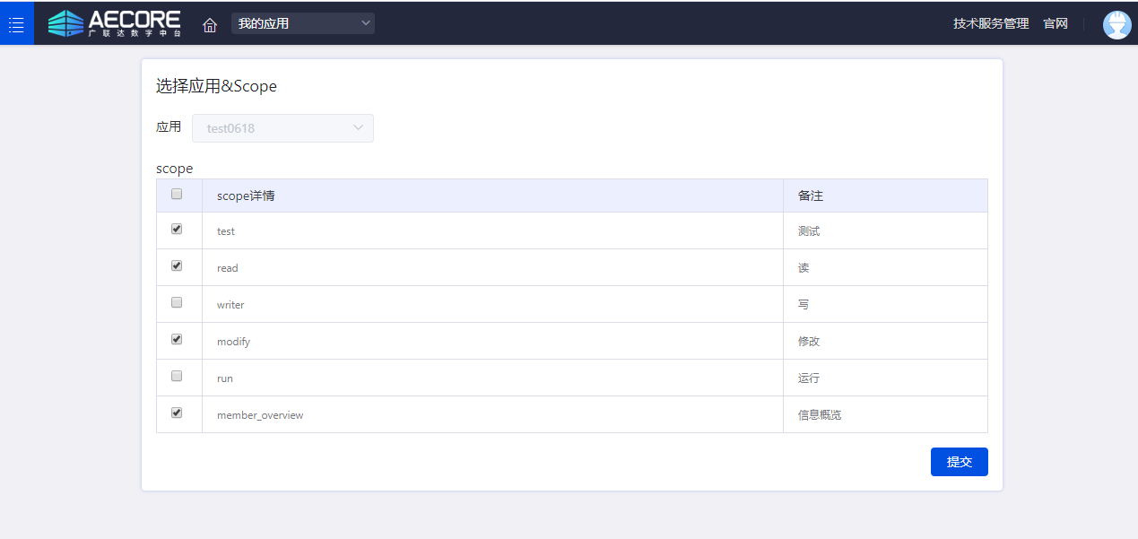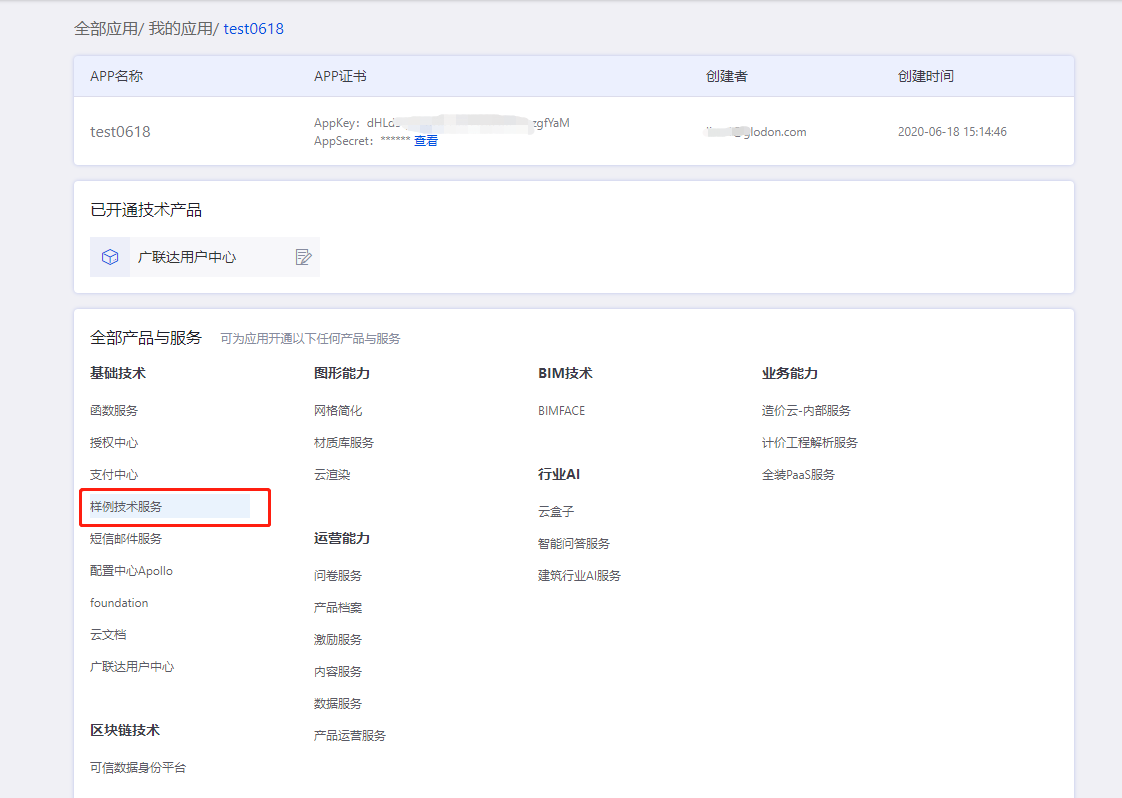 应用创建成功后即刻进入到应用详情页,在应用详情页,你可以查看应用证书(即appkey和appsecret),可选择AECORE平台上上架发布服务,进行服务开通订阅。