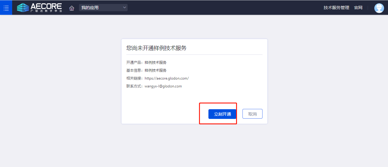 以开通“样例技术服务”为例,操作如下