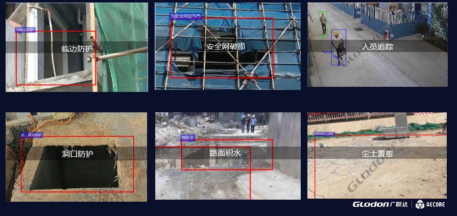 以施工现场安全隐患管理为目标,开发智慧工地现场隐患识别功能,实现针对施工人员入口、高危工作区、配电箱、建筑垃圾堆放区等常出现隐患的地方实时监管和安全隐患智能识别。当识别出危险的时候,进行安全报警通知,并在后台可实时查看施工现场的安全分析结果。