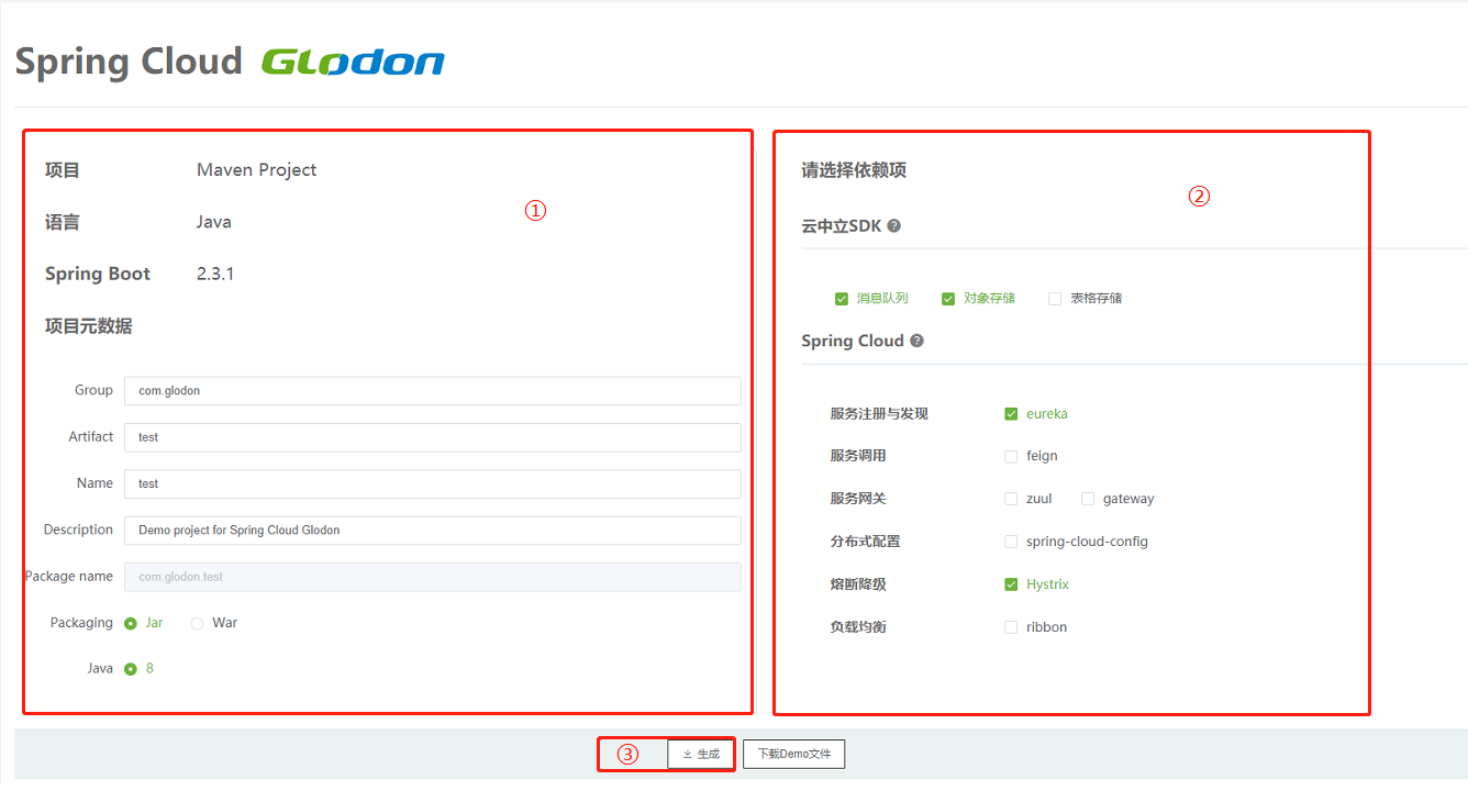 点击Spring Cloud Glodon服务,访问start页面,生成项目工程。