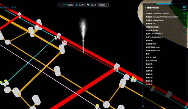 多样的三维特效场景(白天/夜晚、实景/虚拟化场景、晴朗/雨/雪/雾、离子特效),保证了信息在3D场景下的逼真呈现。支持城市运营管理阶段的场景特效,如爆管、水淹、火灾、烟雾;支持自然现象及模拟仿真,如风、雨、水、火、地震等。
